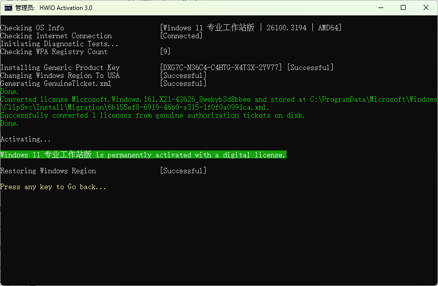 选择“1”:采用 HWID 激活方式,数字许可证永久激活Windows!需联网。